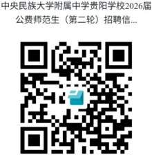 1.凡符合應聘條件者,請點擊下方鏈接(https://f.wps.cn/g/klKlCfdj/)或掃下方二維碼填寫《中央民族大學附屬中學貴陽學校2026屆公費師范生(第二輪)招聘信息表》,填寫時請保證所提供的個人信息真實有效,若因提供虛假信息或隱瞞相關情況影響錄用的,后果自行承擔。